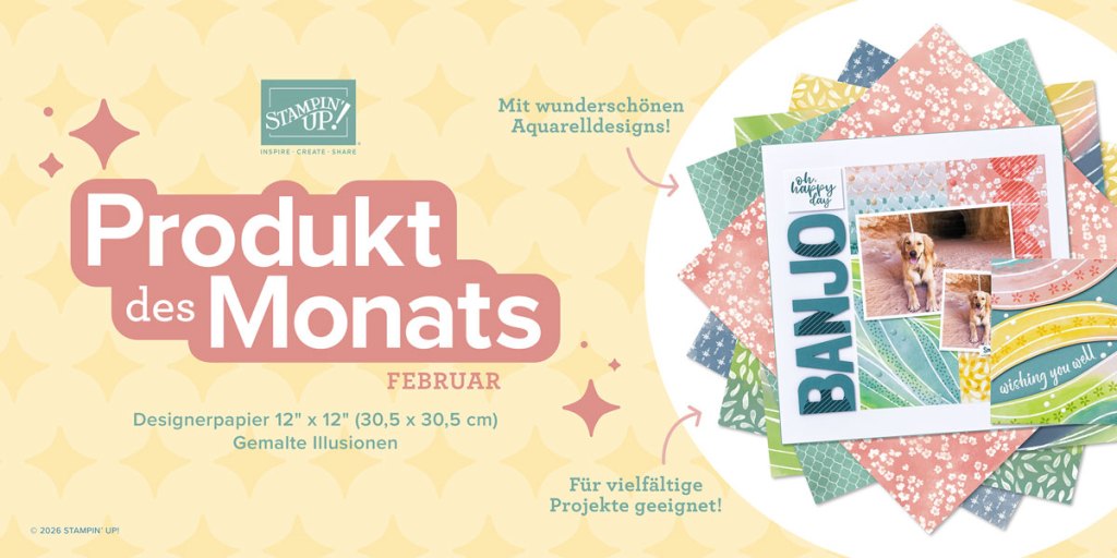 - Jeden Monat halte ich zudem meinen kostenlosen Kartenworkshop auf Facebook und YouTube, wo ich 4 Projekte vorbastle und dir das entsprechende Bastelpaket zu deiner Stampin‘ Up!-Bestellung aus den aktuellen Katalogen schenke.